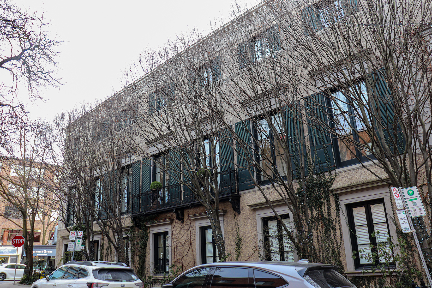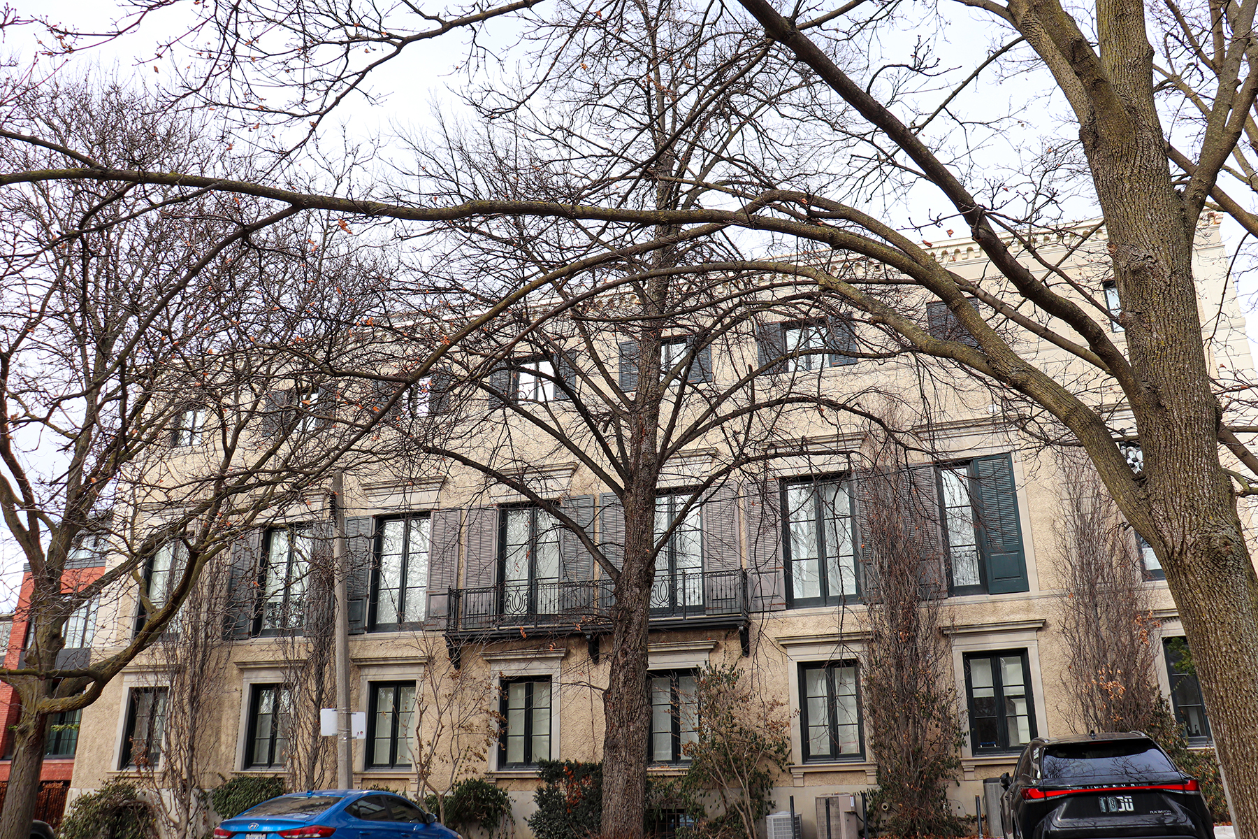From the outside, the bay windows are trimmed with stone and terra cotta details. The central Juliette balconies are paired with floral & abacus style wrought iron patterns. The cornice with corbelling dentils helps decorate the flat roof.