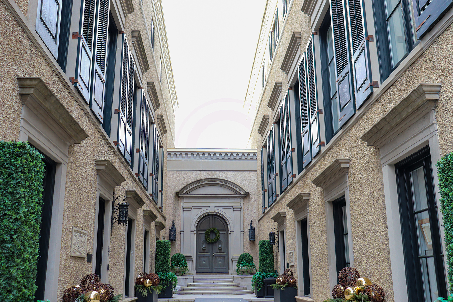 Behind the wrought iron gate is a beautiful communal courtyard. The U-shape block lets in plenty of natural light while minimizing city noise for each unit.