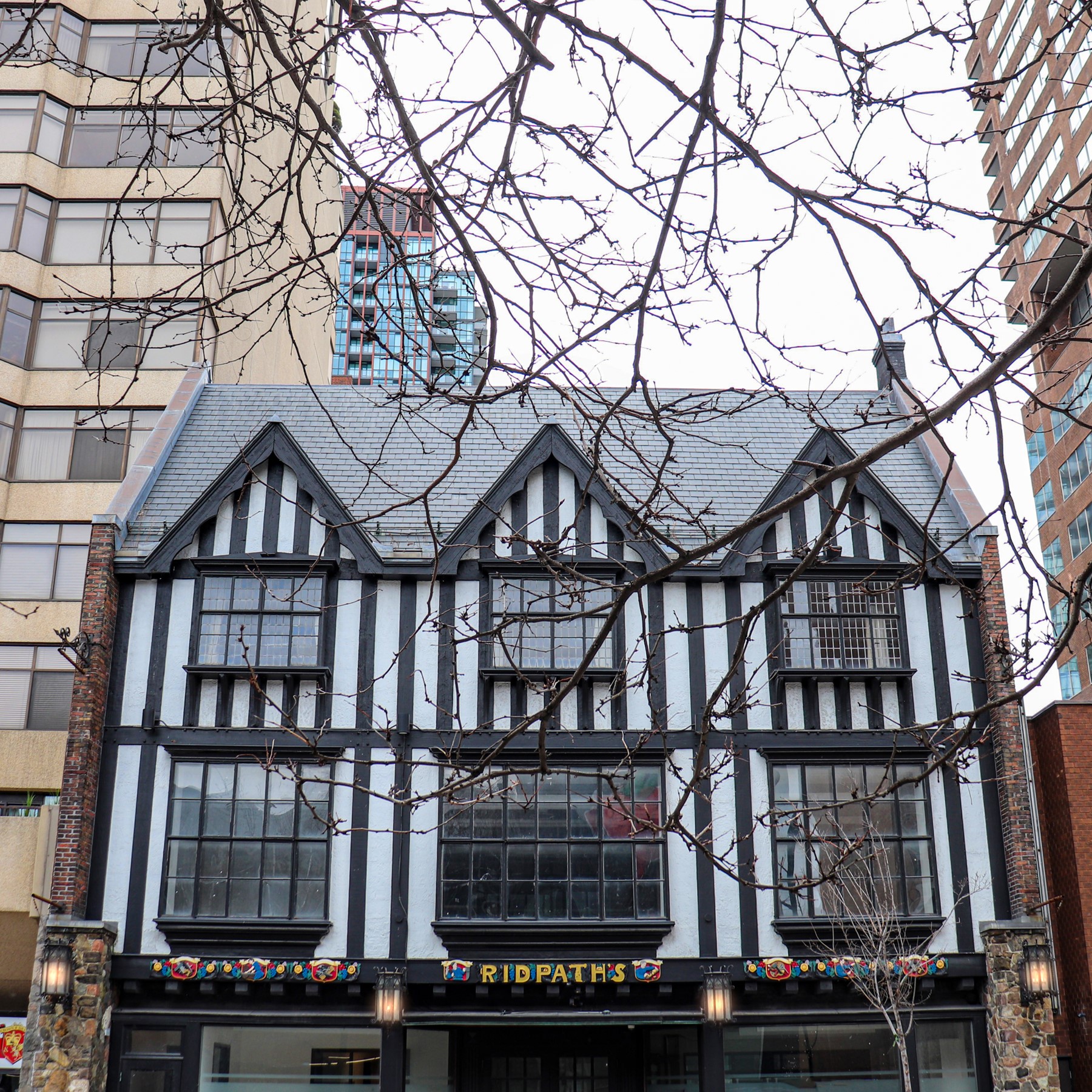 The Tudor Revival style takes inspiration from medieval England, and a notable example in Toronto is Ridpath’s Furniture (1928) at 906 Yonge Street, Yorkville. Mirroring a medieval dwelling in England, built in Tudor Revival style, the Ridpath building has the signature Tudor black timber décor with faux white chalk filling in between, forming a “zebra” pattern.
