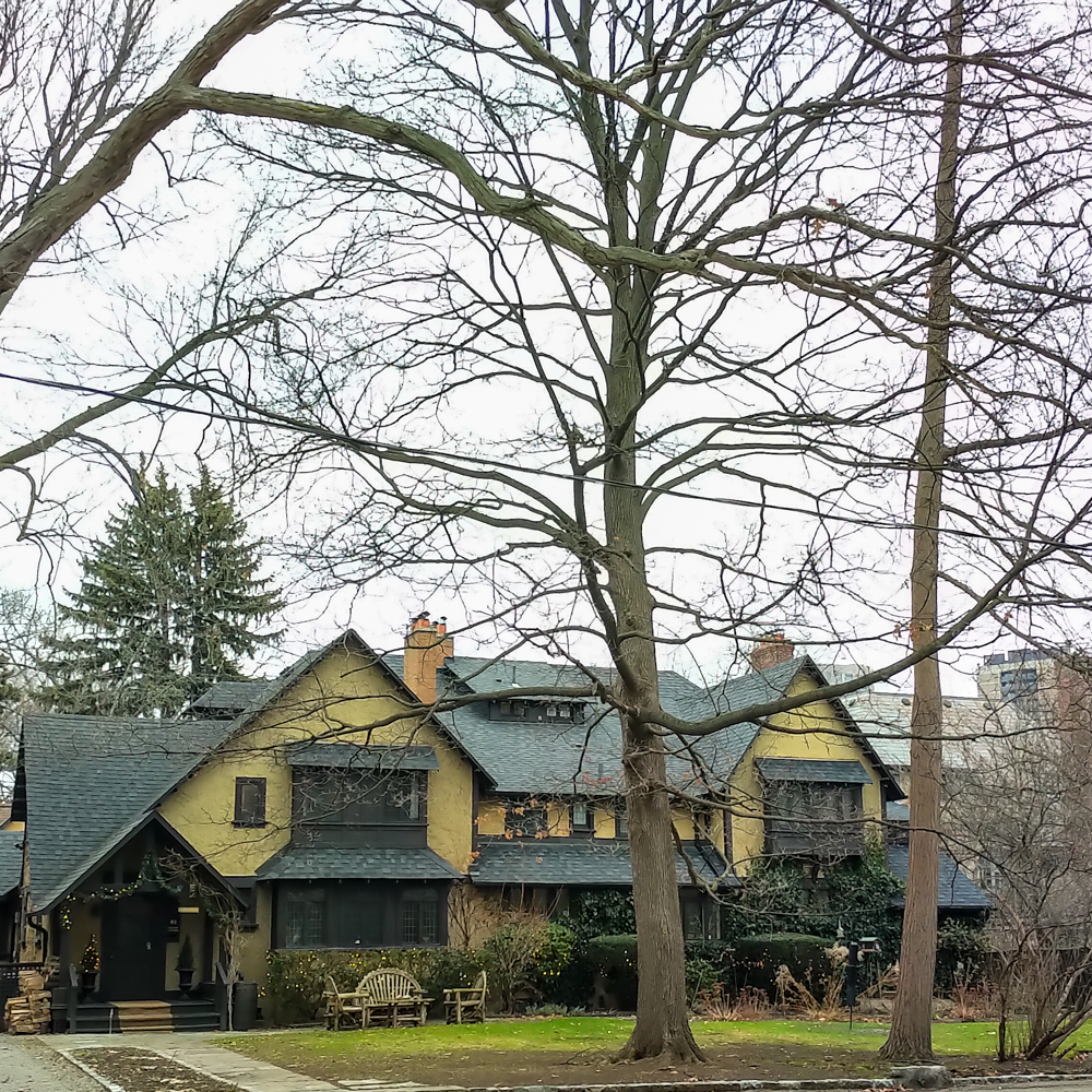 Another notable example of a Regency style house is Drumsnab (1834) at 5 Drumsnab Road, Rosedale. Like Colborne Lodge, it uses a lighter color, with a white façade, an off-center entrance, and a wide wrap-around verandah that goes around the house. Drumsnab’s humble and reserved styling predates most 1920’s stockbroker mansions by nearly 100 years, a time when Rosedale was considered “rural” Toronto. It is also the oldest house in Rosedale.