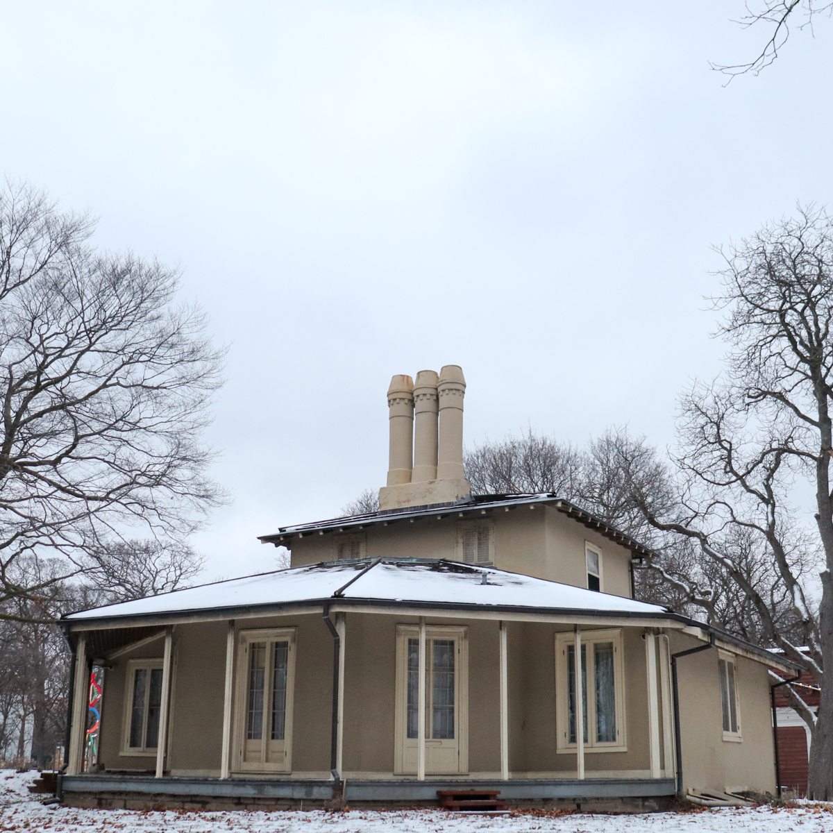 A notable example of Regency style heritage house in Toronto is Colborne Lodge (1836) at 11 Colborne Lodge Drive, High Park. Built in 1836 by architect John Howard, Colborne Lodge does not conform to the standard center hall plan of a traditional Georgian house. The polygon-shaped verandah is the center of attention. The house is now a museum open to the public.