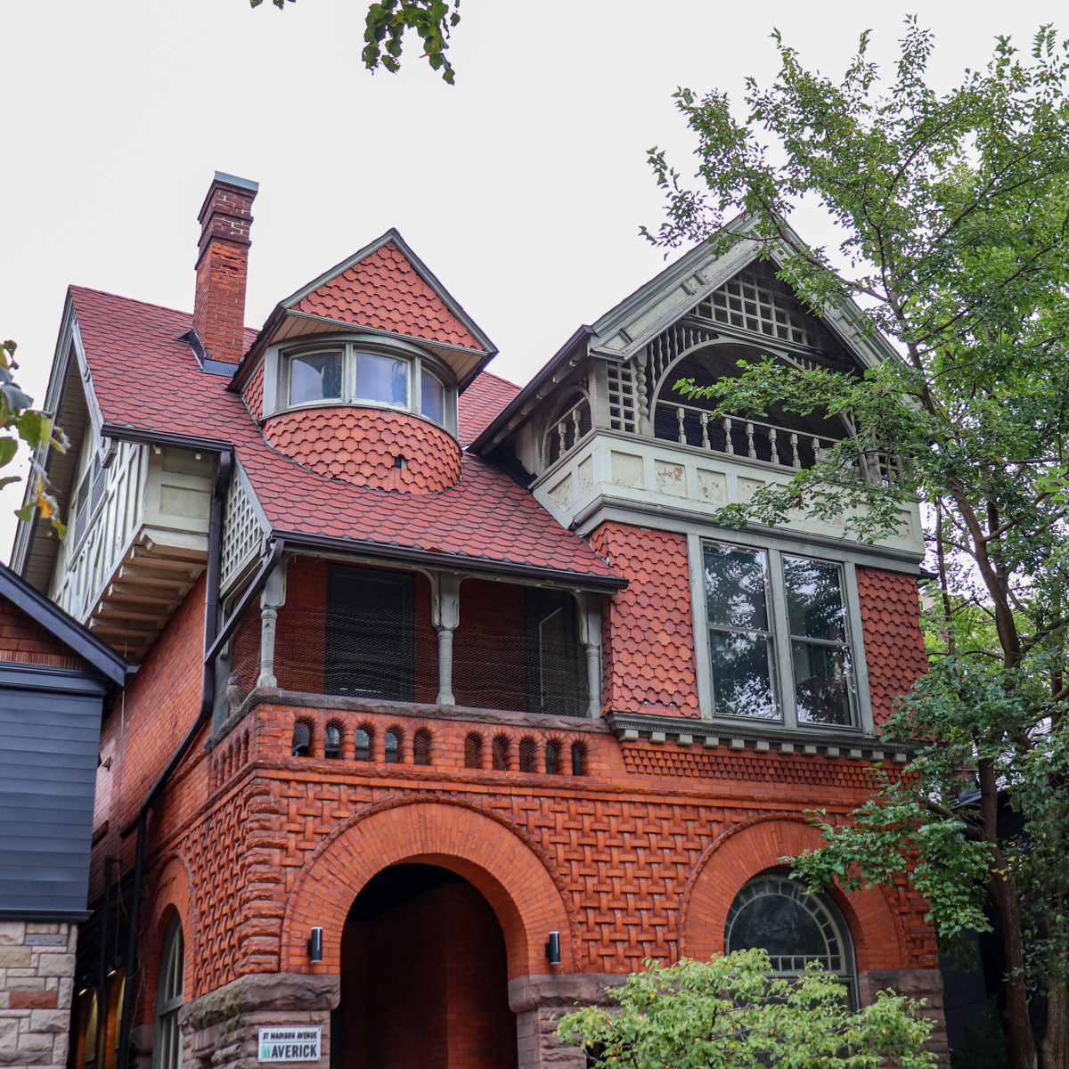 Therefore, Lennox reduced the design in scale. Lukes House (1887) at 37 Madison Avenue, The Annex still has the signature stone façade of a Richardsonian Romanesque heritage house. However, the house also features a semi-circular dormer with fish-scale shingles. There is also a porch on the 2nd and 3rd floor with some basket-weave brickwork above the arches.