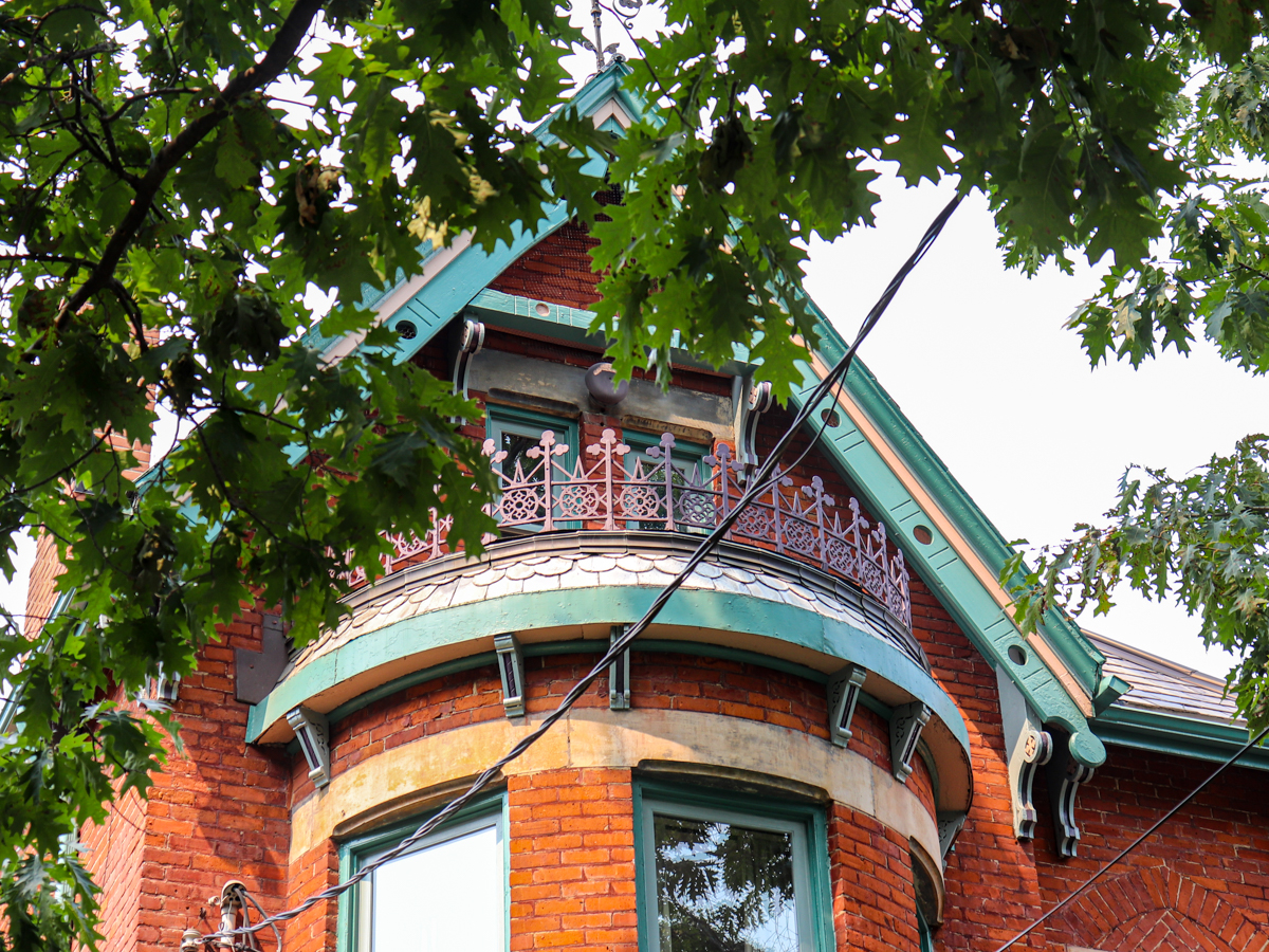 Built for Frederick Nicholls, a merchant in Toronto, this detached Victorian-era brick house features bow bay windows which are double floored with a semi-elliptical curvature, supported by decorative extended eaves on each floor.