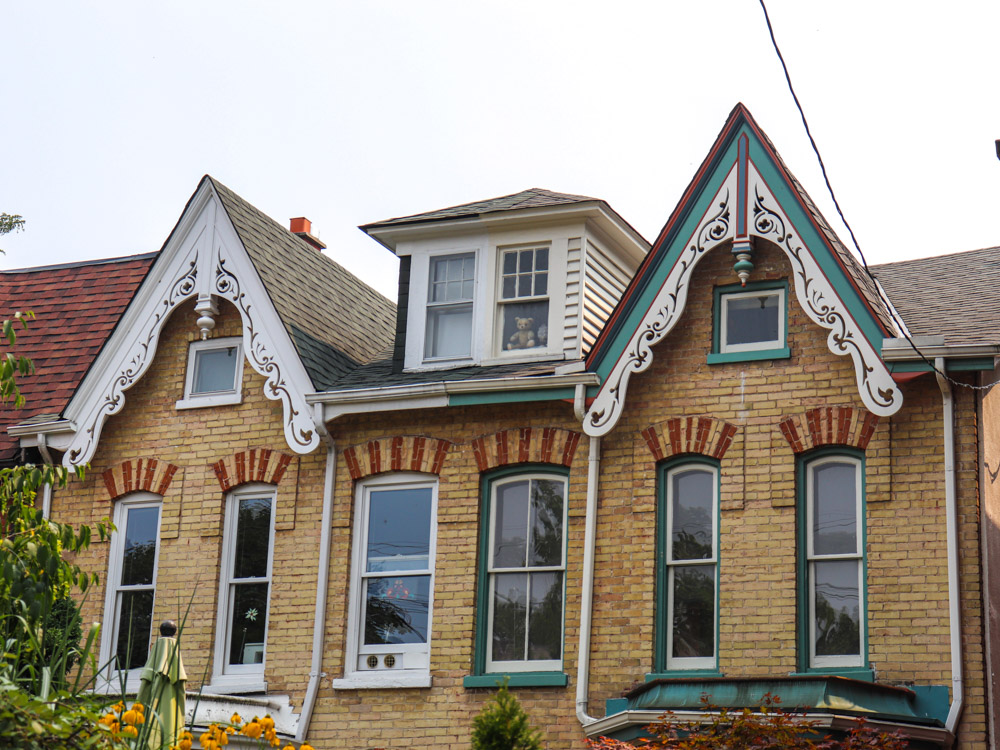 Made from pierced bargeboards, the intricate gingerbread gable trim gives the classic Cabbagetown bay-n-gable style townhome a zest of Gothic Revival style.