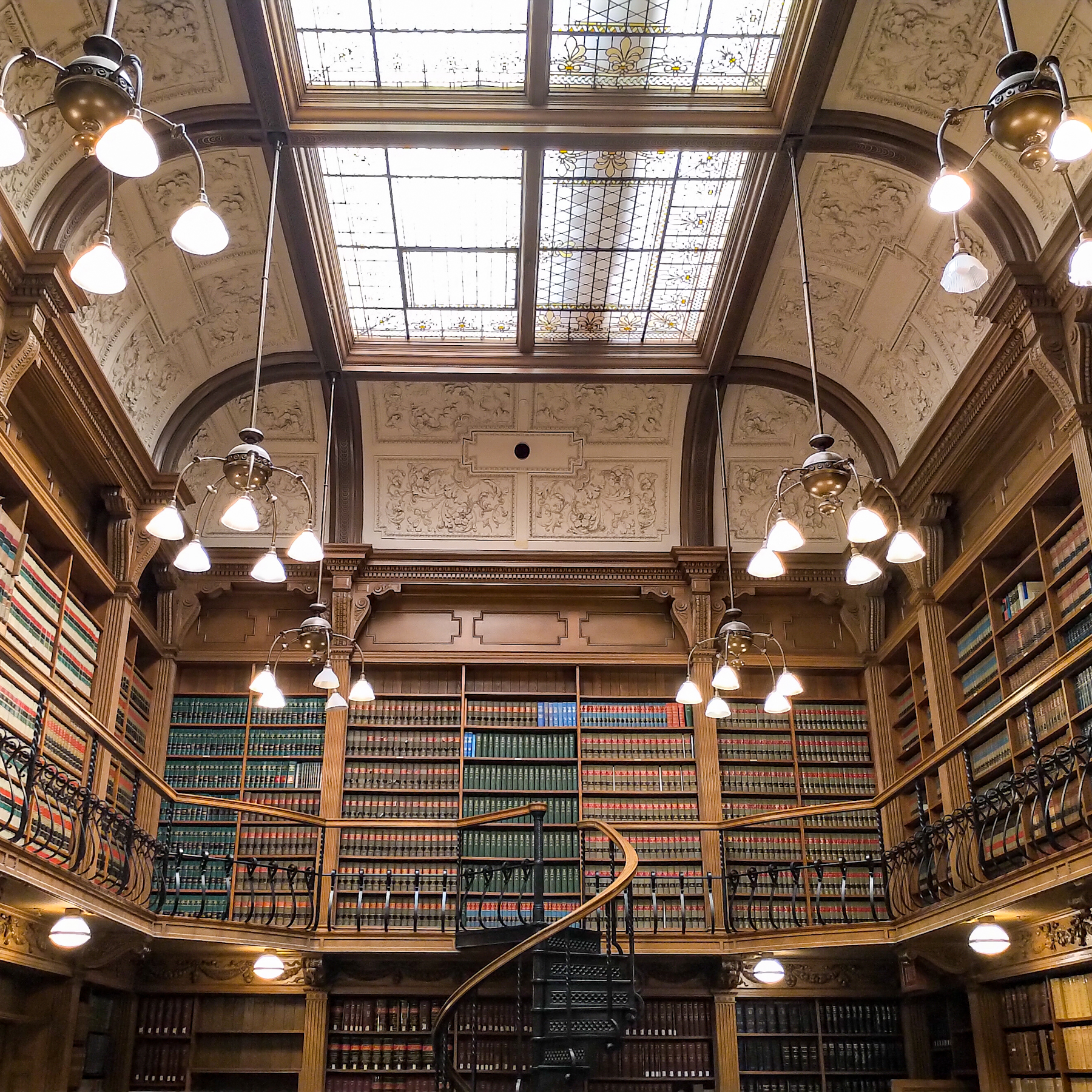 The floral stained-glass skylight and electric copper candelabra, the first room to be electrified at Osgoode Hall, provide warm lights to its visitors.
