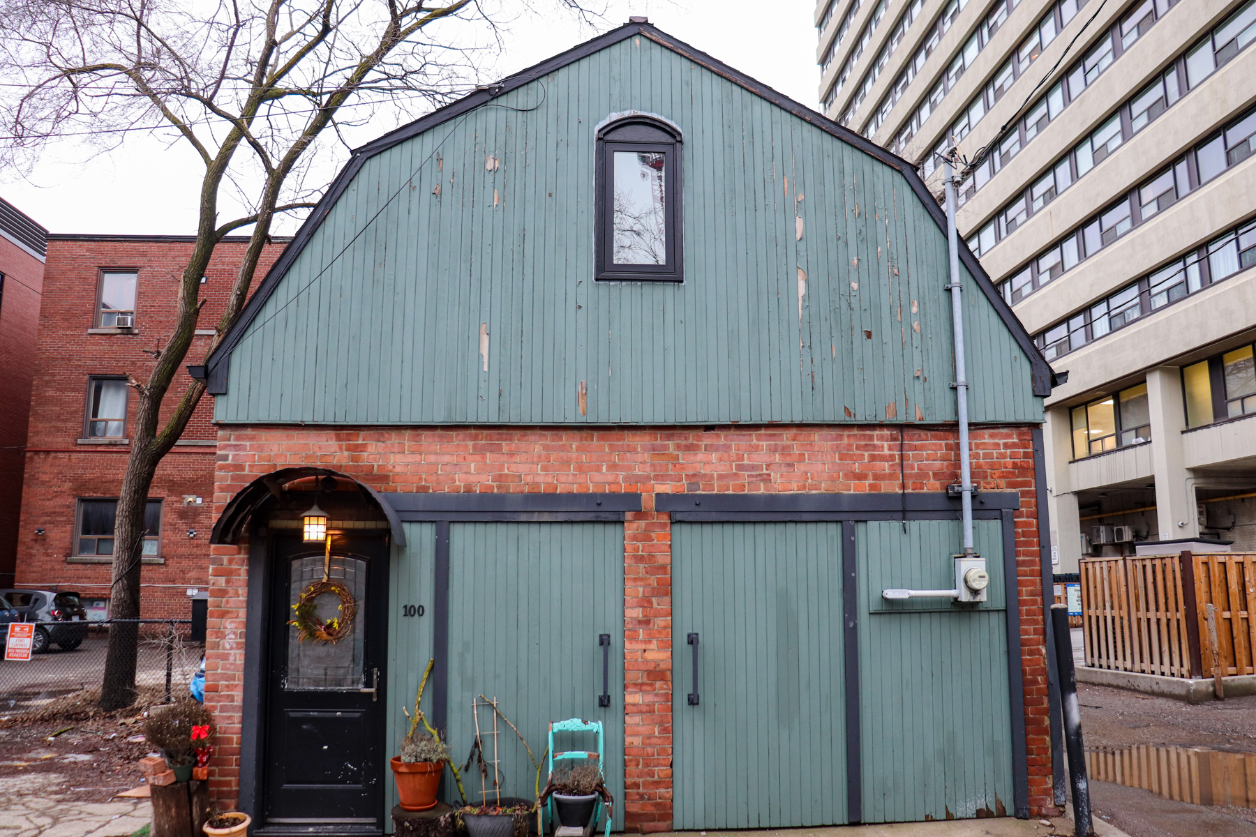In London (England), coach houses are known as “Mews Houses”. Toronto may lack the rows of elegantly restored mews / coach houses like Kynance Mews in London, but it makes up for that by having unique architectural juxtapositions such as this.